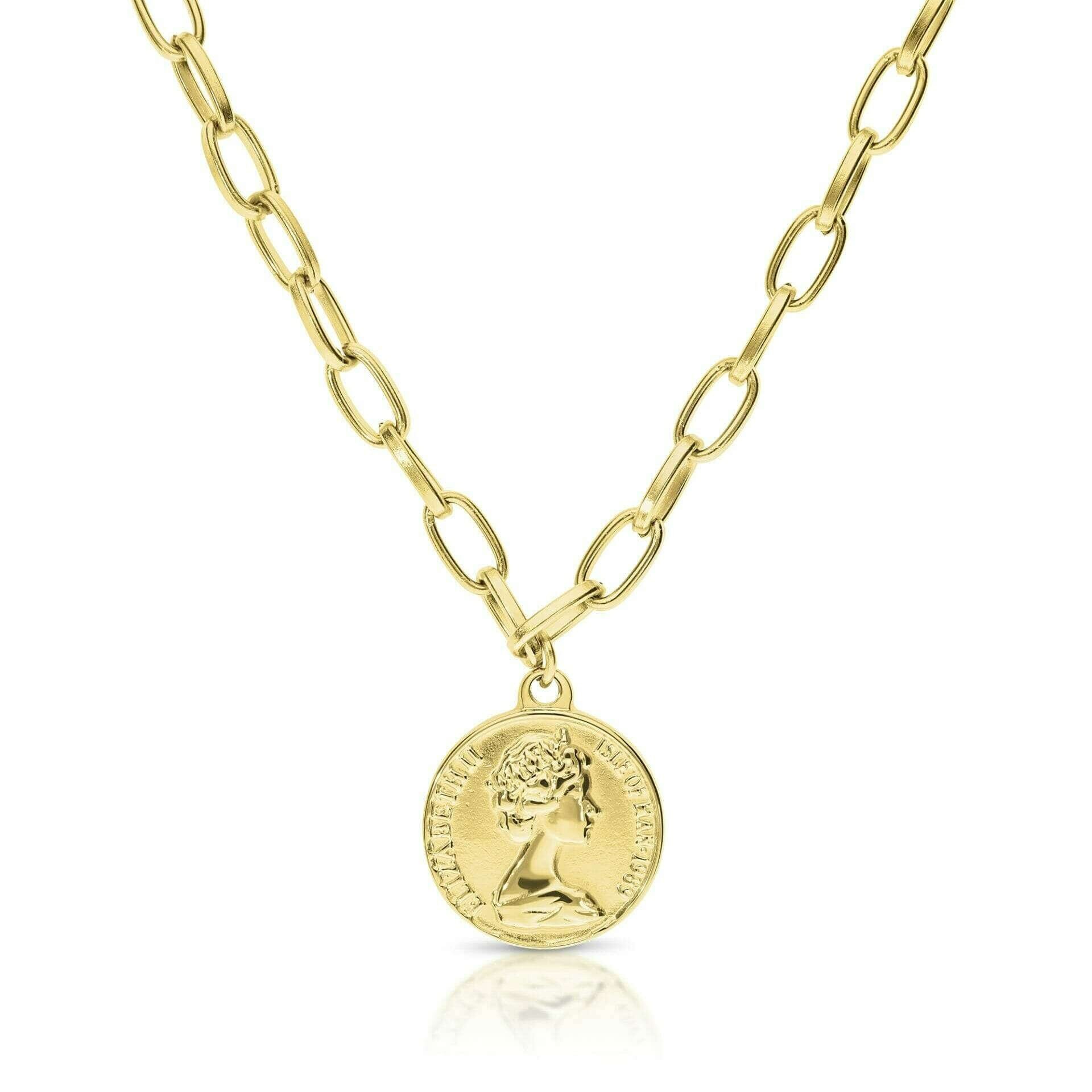 A gold-colored link chain combined with a coin that adds a modern twist