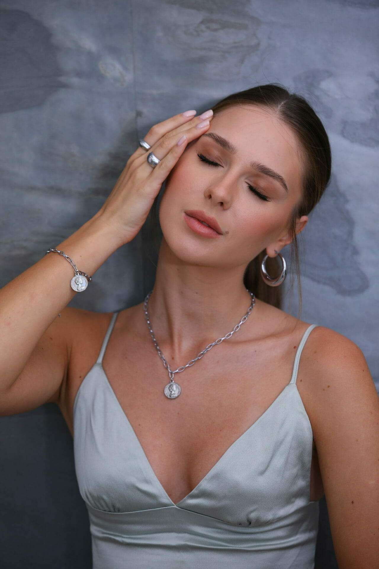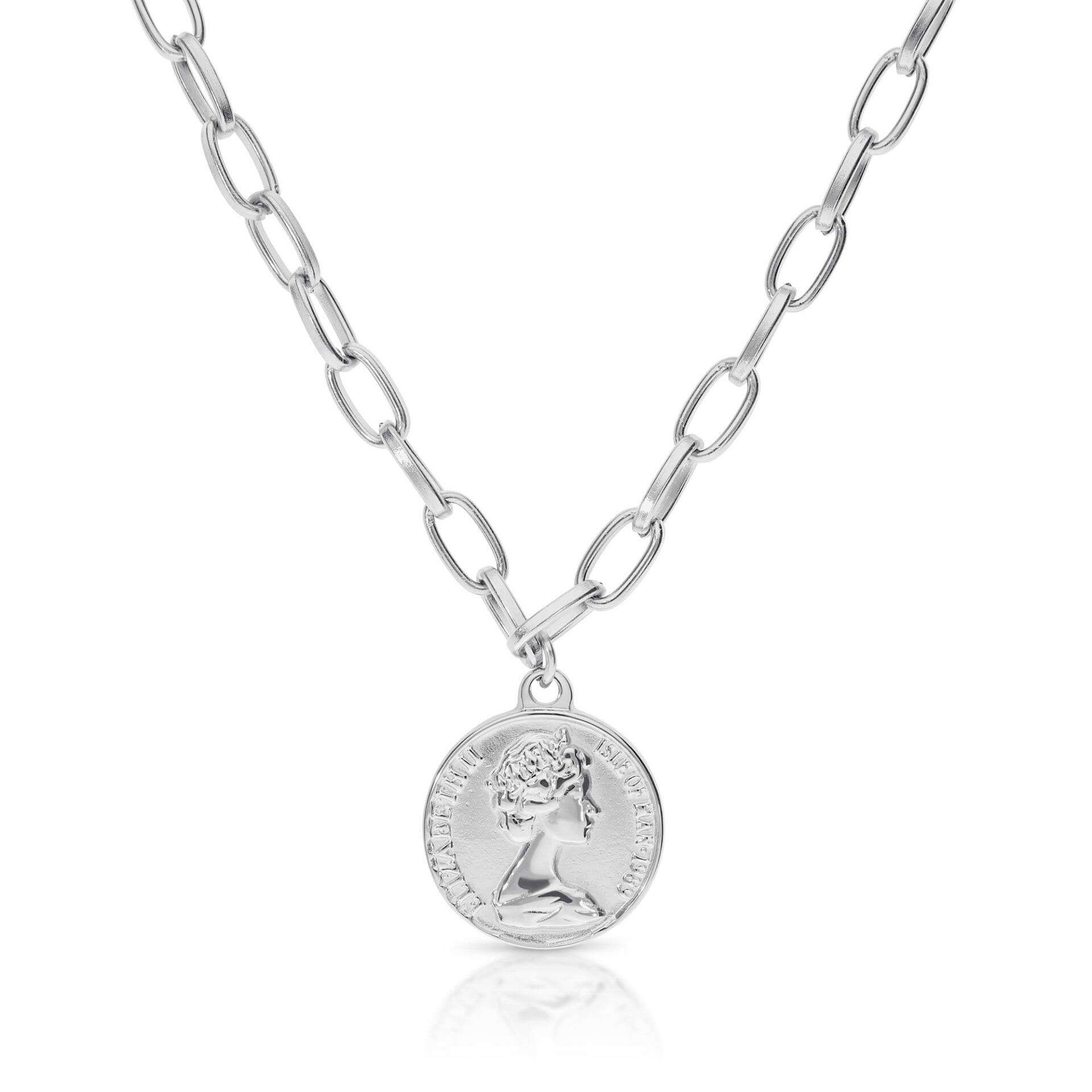 שרשרת חוליות בצבע כסף בשילוב מטבע שמוסיף טוויסט עדכני